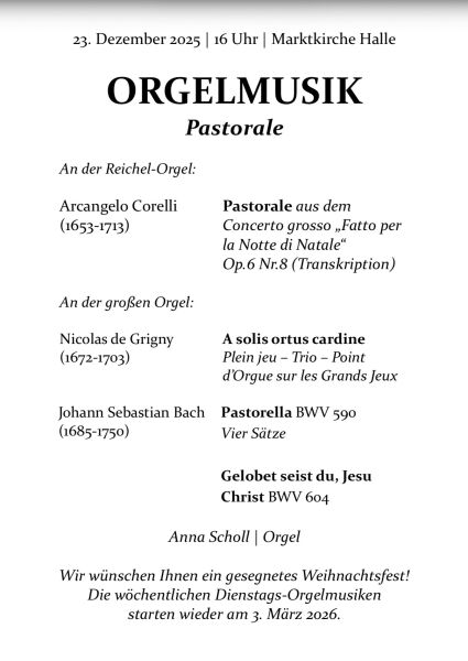 Evangelische Marktkirchengemeinde HalleSie sind hier: Gemeinde > Aktuelles > Letzte Orgelmusik am 23. Dezember 2025